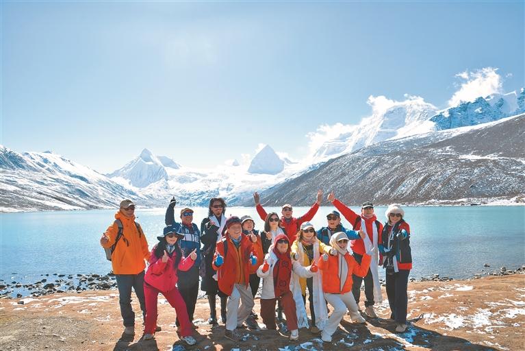 圖為電影主創(chuàng)人員與比如縣薩普旅游景區(qū)游客合影。本報記者 汪純 攝