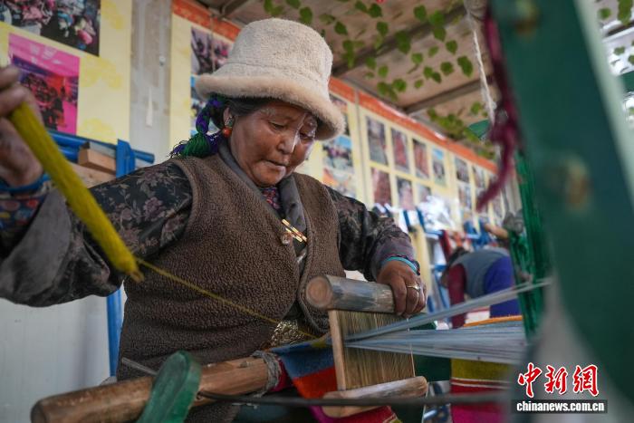 圖為合作社員工旦卓正在編織邦典(藏式圍裙)。貢確 攝