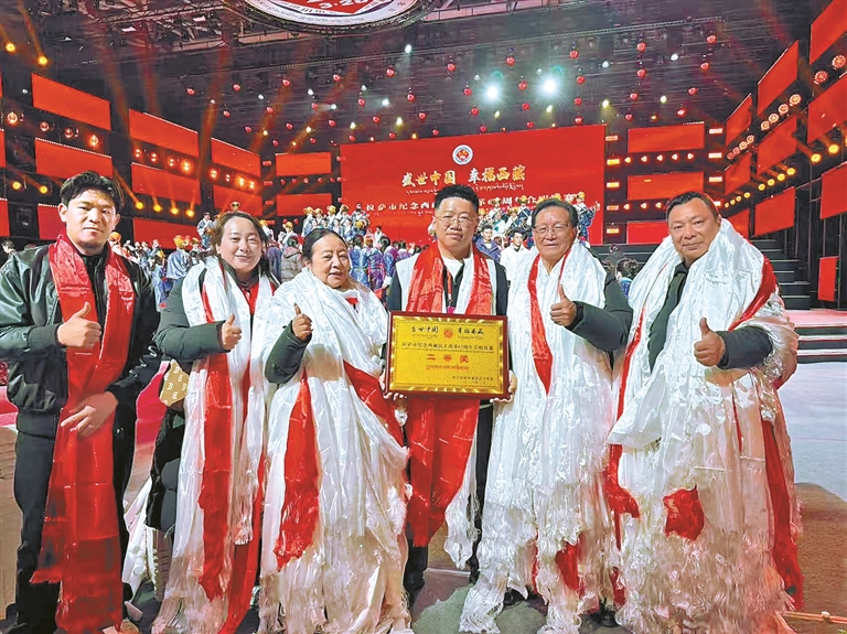 “盛世中國·幸福西藏”合唱比賽中,由向陽花(左三)指導(dǎo)的當(dāng)雄代表隊(duì)榮獲二等獎(jiǎng)。