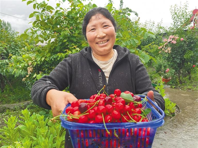 村民在展示從自家庭院中采收的櫻桃。 黃海芬 攝