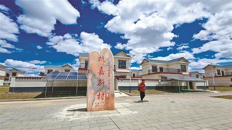 下高速后,沿著嶄新的鄉(xiāng)村鋪裝路面,幾分鐘便可到達(dá)杭嘉新村。85套裝配式結(jié)構(gòu)的民房映入眼簾,兼具藏式民居和江南水鄉(xiāng)特色的建筑造型,是浙藏兩地交往交流交融的美麗結(jié)晶。