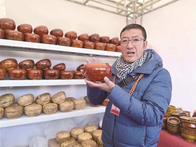 參展商戶們早早備好貨物,在展位前忙碌接待,不少人首日就收獲滿滿。不丹籍商戶扎西已是第二年參展,去年10萬元貨物售罄的好業(yè)績讓他今年信心倍增,帶來價值30萬元-40萬元的8個品種的產(chǎn)品,“物交會的人氣一年比一年旺,去年結(jié)識的本地合作伙伴今年還來進貨,加上今年有物流補貼和線上推廣,我的木碗能賣到更遠的地方,太省心了。”加查縣商戶群培帶著自家手工制作的木碗連續(xù)參展20年,開幕僅一個多小時就入賬3000余元,他感慨道:“從跟著父親來擺攤到如今有了固定展位,物交會越辦越規(guī)范,如今不僅僅是本地顧客認可我們的手藝,還有外地游客也會前來咨詢購買,生意越來越有奔頭。”
