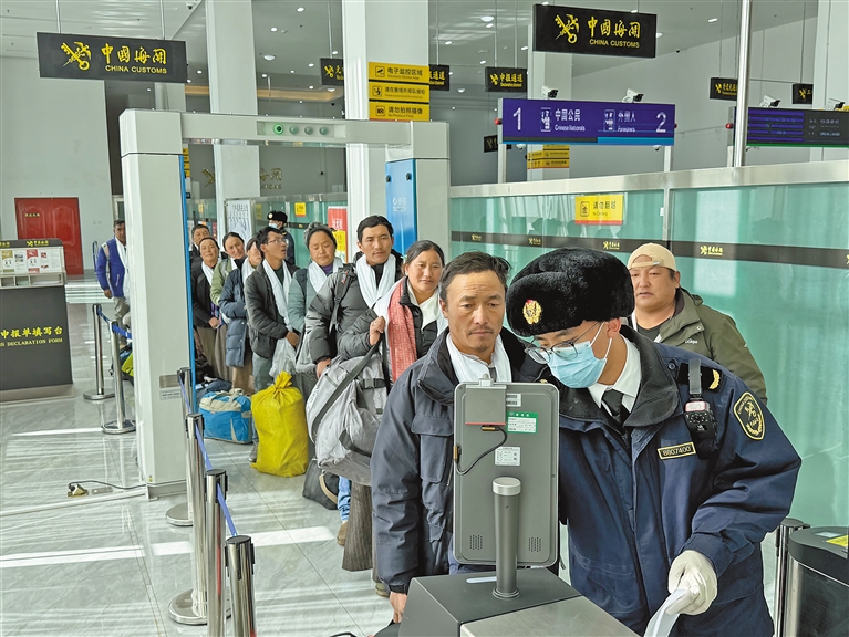 圖為拉薩海關(guān)所屬日喀則海關(guān)關(guān)員在里孜口岸開展監(jiān)管查驗工作,確保旅客入境順暢。圖/文 記者 李梅英
