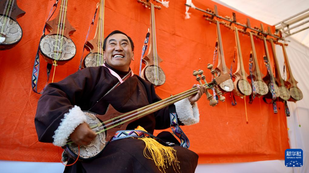 12月2日,洛桑曲扎在雅礱物資交流會(huì)現(xiàn)場(chǎng)彈奏扎念琴。(周昱龍 攝)