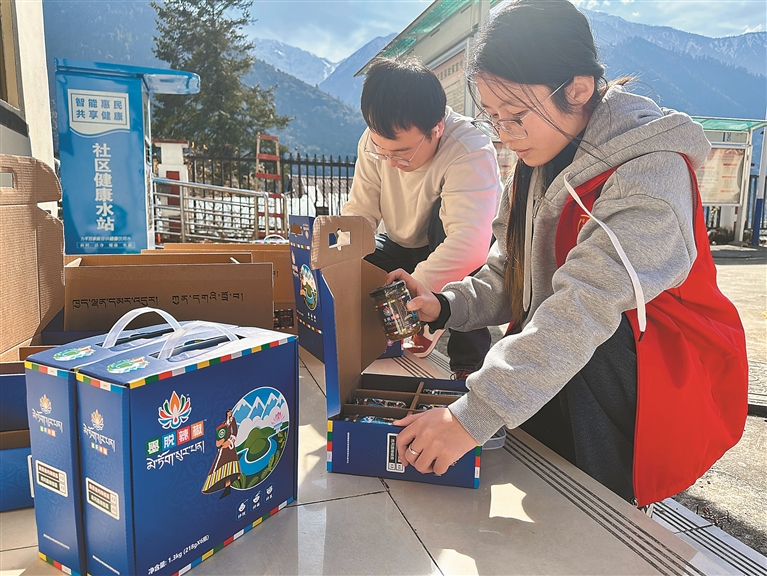 圖為墨脫縣格當鄉(xiāng)黨員干部將辣椒醬裝箱。記者 王敏 通訊員 郎玲 攝