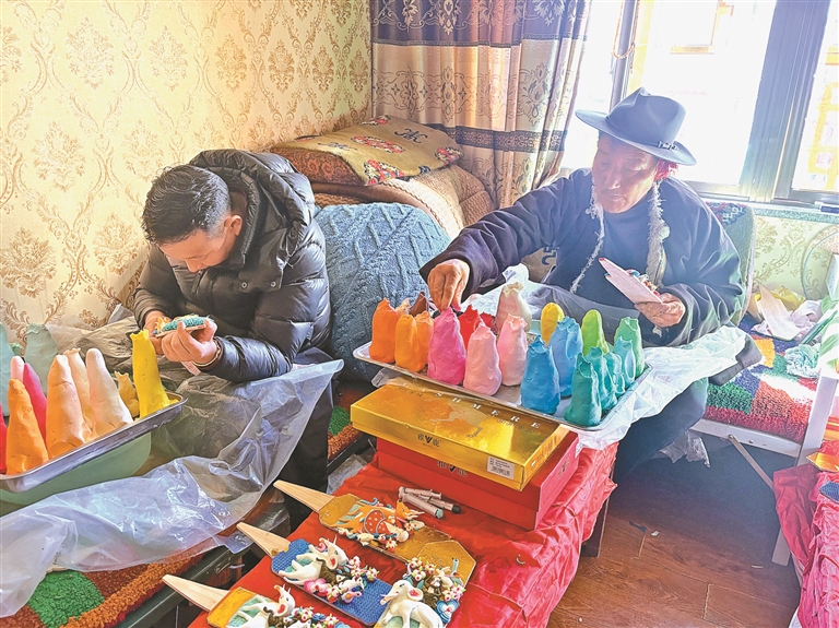 多年來(lái),羅布累計(jì)培養(yǎng)了400多名學(xué)徒。每年藏歷新年前,他都會(huì)組織為期一個(gè)月的集中培訓(xùn),之后帶著大家到拉薩共同參與酥油花創(chuàng)作。不少學(xué)徒學(xué)成后技藝精湛,靠著這門手藝站穩(wěn)了腳跟。如今,酥油花制作已成為當(dāng)?shù)卮寮w經(jīng)濟(jì)發(fā)展的重要支柱,更是改善群眾生活的主要收入來(lái)源,村里不少家庭全家參與制作,人人都是技藝傳承人。