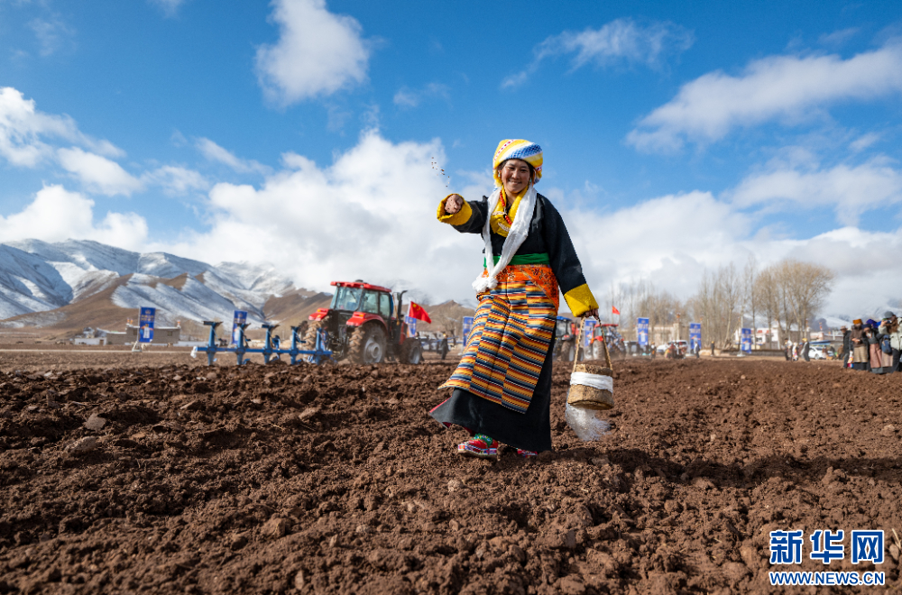 3月16日,身著節(jié)日盛裝的群眾在西藏拉薩市林周縣春堆鄉(xiāng)春堆村的農田上播撒青稞種子。新華網(wǎng) 旦增努布 攝