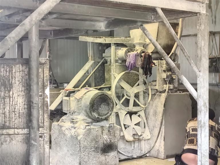 4月10日11時(shí)許,記者跟隨城關(guān)區(qū)市場(chǎng)監(jiān)管局執(zhí)法人員穿過米瓊?cè)账淼?,來到一處由幾間簡(jiǎn)易鐵皮房圍建而成的院落。該院落臨近米瓊?cè)丈铰罚瑥耐饷婵?,任誰(shuí)也想不到這里是一家制粉廠。院落左側(cè)有一間不足60平方米的加工室,室內(nèi)一個(gè)寫有“粉料攪拌機(jī)”字樣的儀器上,布滿了白色污垢。