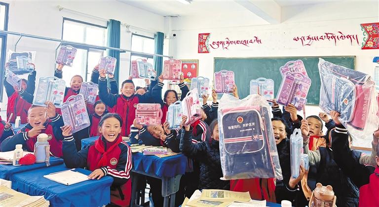 圖為安多縣瑪榮鄉(xiāng)小學(xué)的孩子們開心地展示干警們發(fā)放的學(xué)習(xí)用品。記者 白瑪澤旺 攝