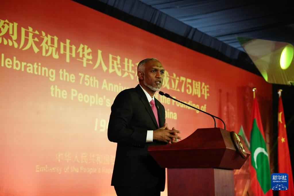 9月30日,馬爾代夫總統(tǒng)穆伊茲在馬累舉行的慶祝中華人民共和國(guó)成立75周年招待會(huì)上致辭。新華社記者 陳冬書 攝