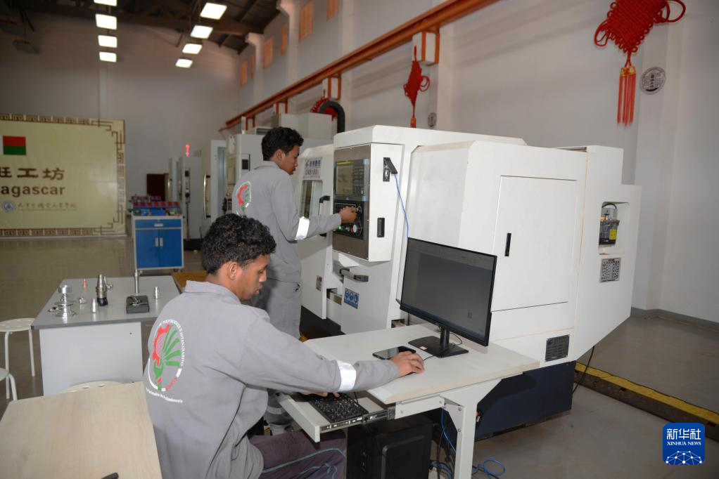 2月10日,在馬達(dá)加斯加首都塔那那利佛的魯班工坊,機(jī)械工程專業(yè)學(xué)生進(jìn)行數(shù)控機(jī)床的教學(xué)實(shí)踐。新華社發(fā)(西塔卡·拉喬納里松攝)
