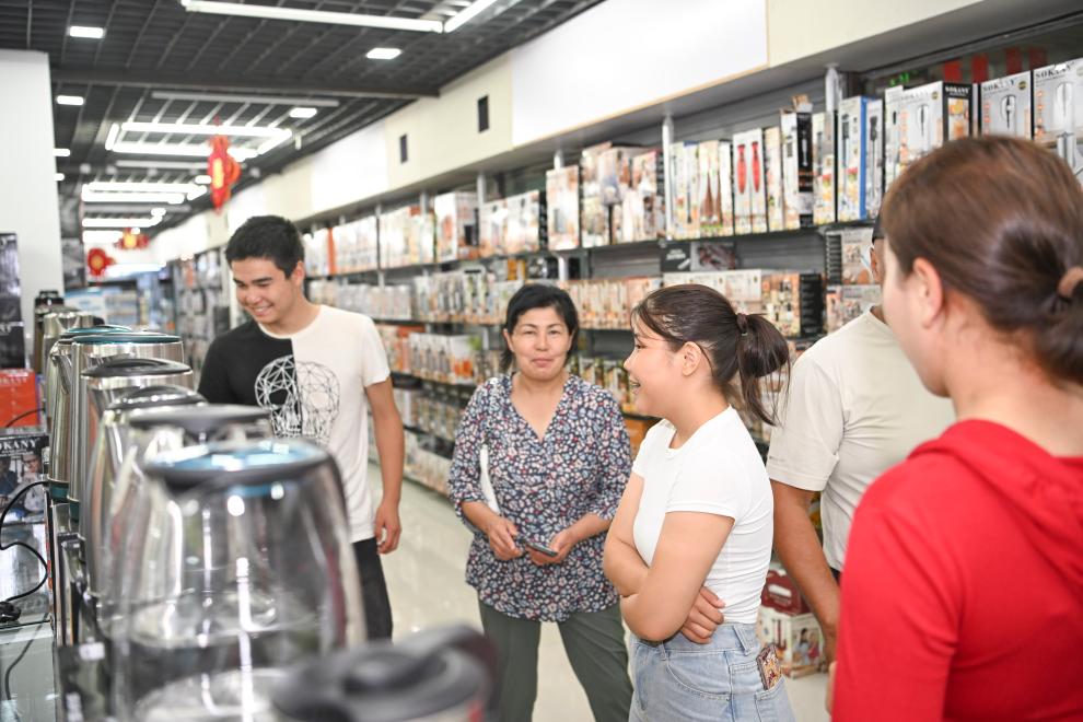 前來(lái)合作中心購(gòu)物的哈薩克斯坦顧客和巴爾然在一起聊天。