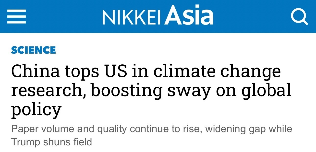 《日經(jīng)亞洲評(píng)論》22日發(fā)布的一篇文章指出,中國在2023年發(fā)表的氣候變化研究論文數(shù)量超過了美國,并在次年擴(kuò)大了領(lǐng)先優(yōu)勢(shì)。這一趨勢(shì)凸顯了中國全球影響力的持續(xù)增長,與此同時(shí),美國卻在逐漸退出這一領(lǐng)域。
