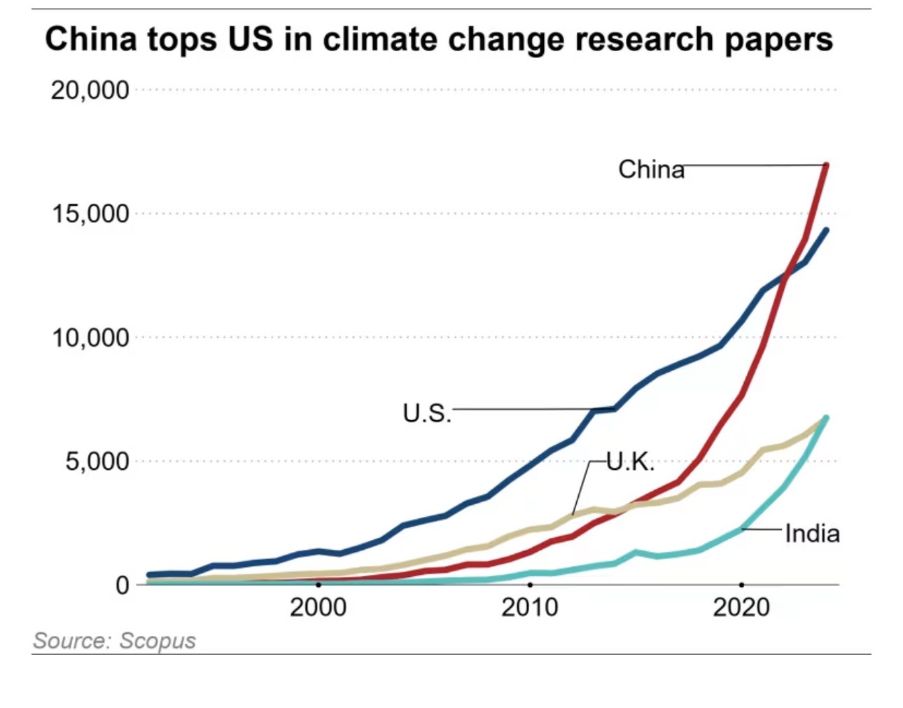 文章說,2023年,中國研究機(jī)構(gòu)發(fā)表了約1.4萬篇?dú)夂蜃兓芯空撐模绹鴻C(jī)構(gòu)的論文數(shù)量為1.3萬篇。2024年,這一差距進(jìn)一步擴(kuò)大。當(dāng)年全球發(fā)表的7.7萬篇?dú)夂蛳嚓P(guān)論文中,中國貢獻(xiàn)了約1.7萬篇,而美國的論文數(shù)量僅為1.4萬篇左右。
