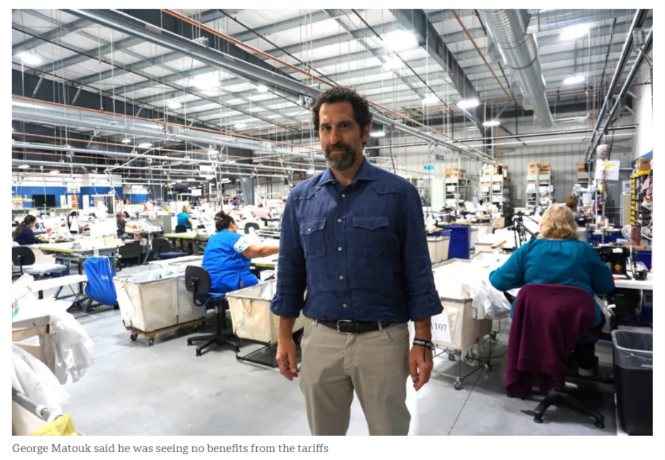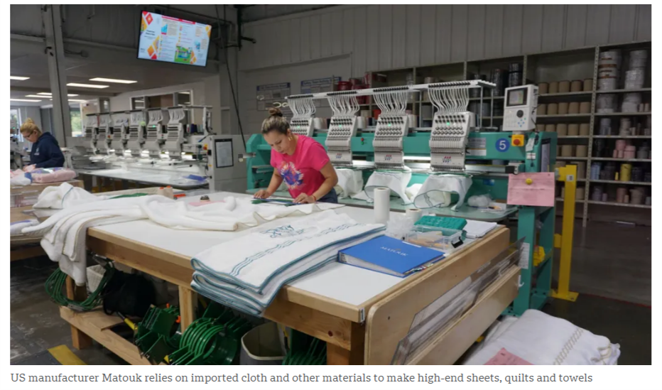 馬圖克表示,從今年4 月到 8 月,關稅導致其每月增加超過 10 萬美元的成本,因為高額關稅影響了來自印度和葡萄牙的棉布、來自列支敦士登的羽絨等原材料的供應。不僅如此,增加的成本還迫使企業(yè)削減了在新設備以及營銷方面的開支。喬治 馬圖克說,他“沒有從關稅中看到任何好處”。