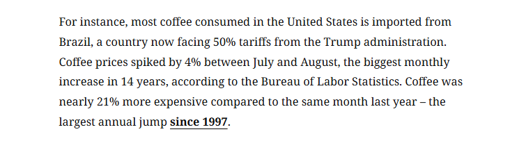 對(duì)于漲價(jià),美國(guó)消費(fèi)市場(chǎng)的現(xiàn)實(shí)數(shù)據(jù)中已有所體現(xiàn):受對(duì)巴西征收50%關(guān)稅影響,咖啡價(jià)格在7月至8月間飆升4%,創(chuàng)14年來(lái)最大月度漲幅;對(duì)墨西哥西紅柿征收17%關(guān)稅后,8月美國(guó)西紅柿價(jià)格漲幅達(dá)4%。