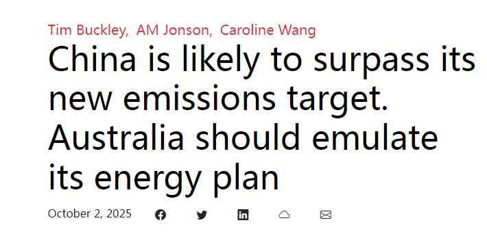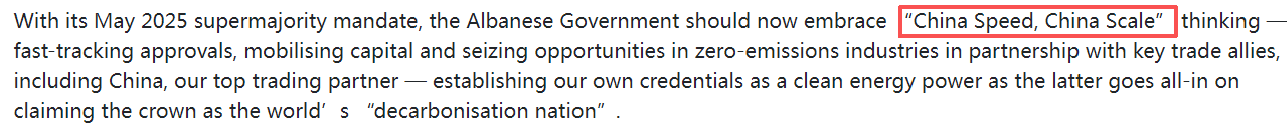 文章說,澳大利亞政府近期也公布了2035年減排目標。澳大利亞能源部長克里斯·鮑文推出的35億澳元“家庭電池補貼計劃”已安裝超6萬套儲能系統(tǒng),證明政策驅(qū)動的轉(zhuǎn)型潛力。分析認為,澳大利亞政府應借鑒“中國速度”,加快審批流程、撬動民營資本,并在零碳產(chǎn)業(yè)領域深化與最大貿(mào)易伙伴——中國的合作,以確立澳大利亞在清潔能源領域的競爭力。