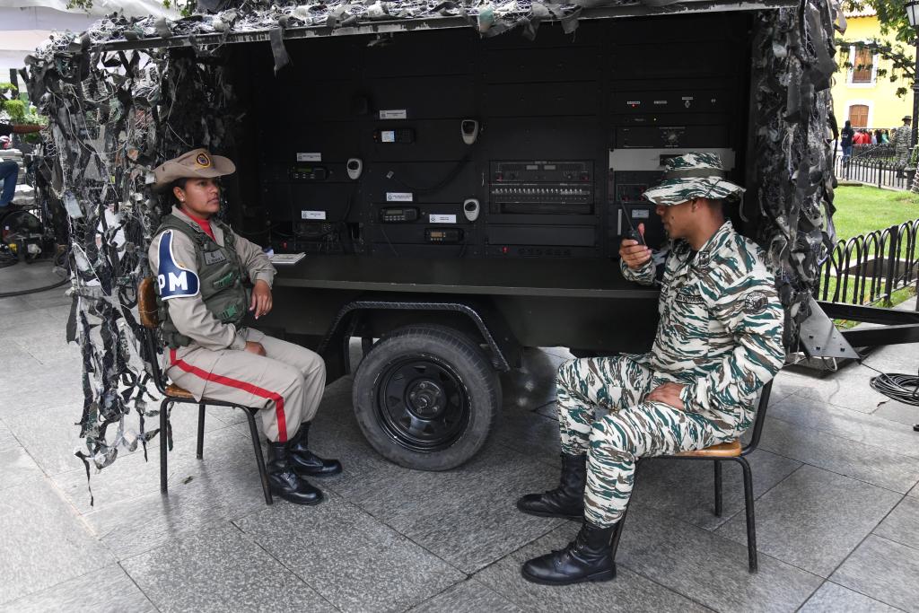 10月4日,在委內(nèi)瑞拉首都加拉加斯的玻利瓦爾廣場,玻利瓦爾民兵組織成員操作通信設(shè)備。新華社發(fā)(馬科斯·薩爾加多攝)