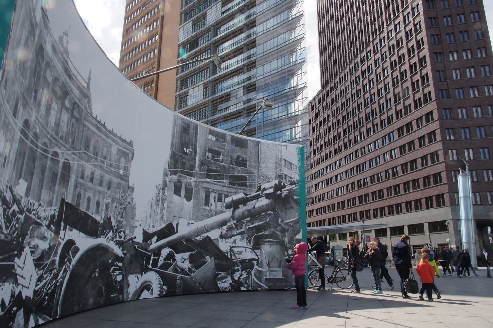 2015年5月1日,人們在德國柏林勃蘭登堡門前廣場上觀看“戰(zhàn)爭與和平間的日常生活”露天圖片展。(班瑋 攝)