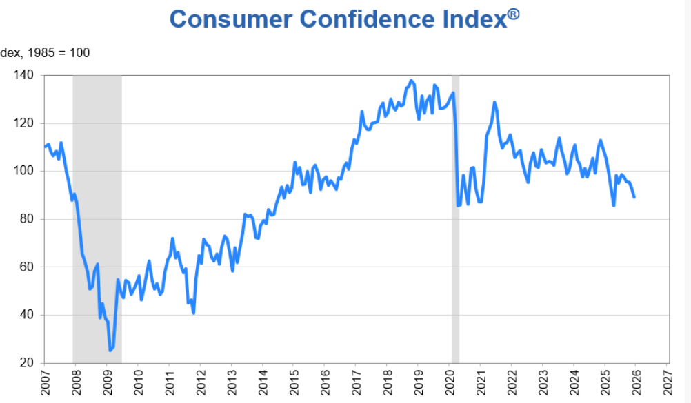 美國研究機構(gòu)世界大型企業(yè)研究會12月23日發(fā)布的初步調(diào)查數(shù)據(jù)顯示,由于對商業(yè)環(huán)境看法負面,對就業(yè)和收入的擔憂加劇,美國12月份消費者信心指數(shù)從11月份修訂后的92.9進一步下滑至89.1,連續(xù)第五個月走低,為今年4月以來的最低水平。