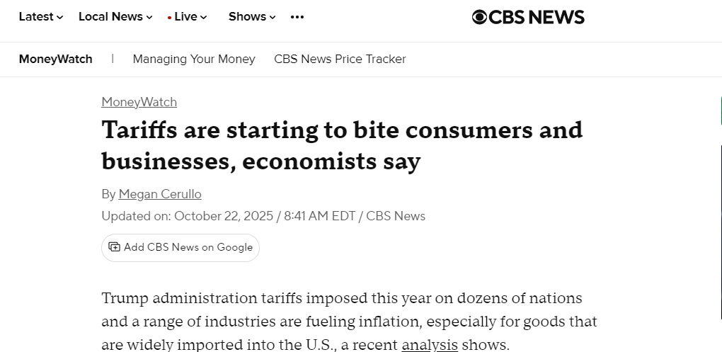 哥倫比亞廣播公司(CBS)新聞網(wǎng)今年10月的報(bào)道也指出,美國(guó)政府實(shí)施的關(guān)稅開(kāi)始“咬噬”消費(fèi)者和企業(yè)。經(jīng)濟(jì)學(xué)家指出,關(guān)稅正在推高通脹,尤其是對(duì)大量進(jìn)口的商品而言。進(jìn)口商通常會(huì)將部分關(guān)稅成本轉(zhuǎn)嫁給消費(fèi)者。今年關(guān)稅預(yù)計(jì)將給美國(guó)企業(yè)額外增加1.2萬(wàn)億美元成本,其中大部分由消費(fèi)者承擔(dān)。