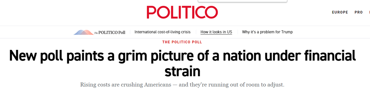 美國(guó)政客新聞網(wǎng)(Politico)12月發(fā)布的最新民調(diào)勾勒出一幅更為嚴(yán)峻的圖景:近半數(shù)美國(guó)人難以負(fù)擔(dān)雜貨、公用事業(yè)、醫(yī)療、住房和交通;因顧忌成本,27%的人不再體檢,23%的人跳過(guò)處方藥;55%的民眾將高物價(jià)歸咎于美國(guó)政府。即使在其支持者中,也有21%認(rèn)為關(guān)稅目前損害經(jīng)濟(jì)。