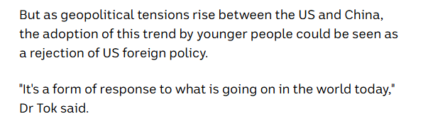 文章還說(shuō),許多創(chuàng)作“中國(guó)時(shí)刻”視頻的博主居住在美國(guó)。墨爾本大學(xué)亞洲研究院講師杜兆愷分析,年輕人的這種文化選擇或許是對(duì)美國(guó)外交政策的隱性反抗?!斑@是對(duì)當(dāng)今世界格局的回應(yīng)。”