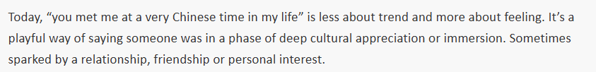 日本英文雜志《大都市》分析說(shuō),“你遇見(jiàn)了我人生中‘很中國(guó)’的時(shí)刻”,便成了沉浸于這類實(shí)踐的代名詞——有時(shí)認(rèn)真,有時(shí)輕松,但總帶著真誠(chéng)的好奇。