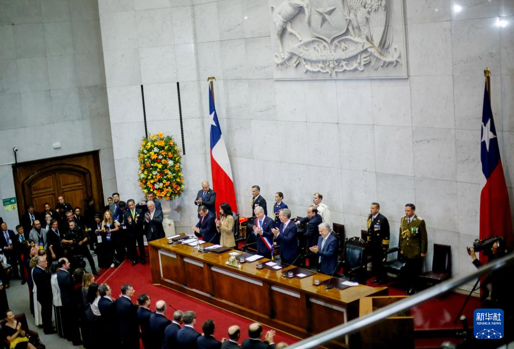 3月11日,在設(shè)于智利第二大城市瓦爾帕萊索的國民議會,智利總統(tǒng)何塞·安東尼奧·卡斯特(中,佩戴綬帶者)出席總統(tǒng)權(quán)力交接儀式。新華社/智利一號通訊社
