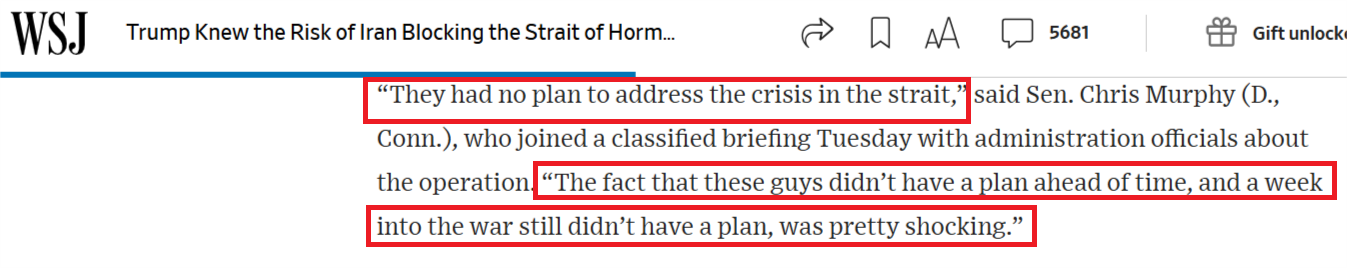 《華爾街日報》14日的報道指出,當前霍爾木茲海峽通行受阻及由此引發(fā)的經(jīng)濟動蕩,反映出美國政府在發(fā)動軍事打擊時缺乏規(guī)劃與深思熟慮。
