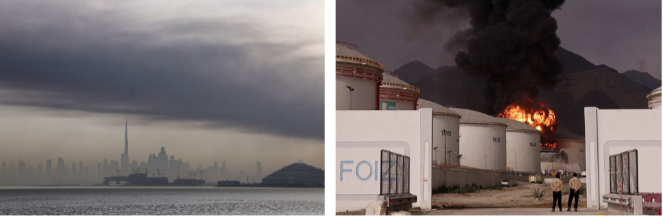 左圖:當?shù)貢r間13日,迪拜上空冒起濃煙 右圖:阿聯(lián)酋富查伊拉一處石油工業(yè)區(qū)14日遭受襲擊發(fā)生火災 圖源:法新社、路透社