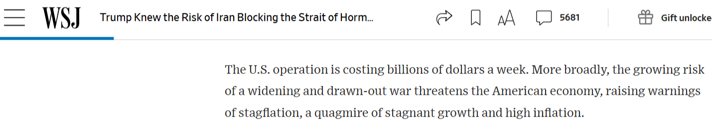 盟友之外,美國民眾也在為這場軍事行動“埋單”?!度A爾街日報》的報道稱,美國國務院直到戰(zhàn)爭開始后才敦促美國公民離開該地區(qū)國家或撤離部分大使館。而當時,商業(yè)空域已關閉,數(shù)萬美國人滯留中東,美國的外交官們在部分大使館也處于危險之中;此外,美國此次軍事行動每周耗資數(shù)十億美元。戰(zhàn)爭不斷擴大且長期延宕的風險日益加劇,正威脅著美國經(jīng)濟,甚至引發(fā)“滯脹”風險。