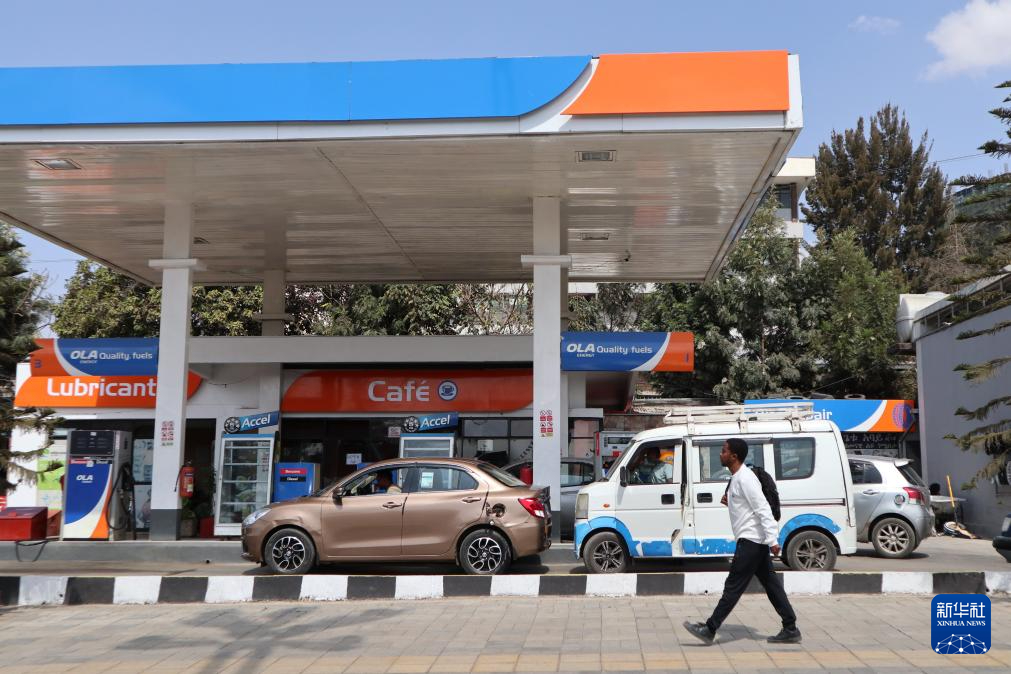 3月17日,在埃塞俄比亞首都亞的斯亞貝巴,行人走過一個(gè)加油站。新華社記者 劉方強(qiáng) 攝
