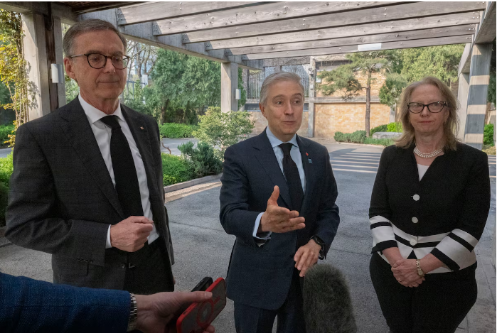 加拿大央行行長蒂夫·麥克勒姆(左)、加拿大財政部部長商鵬飛(中)、加拿大駐華大使梅倩琳(右)