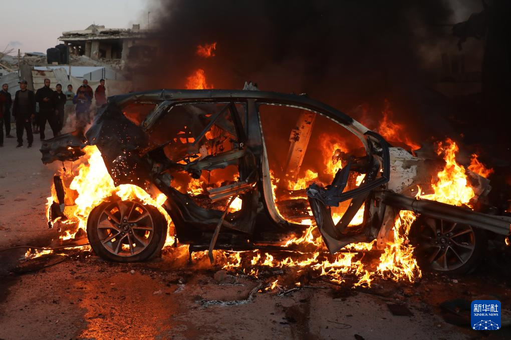 這是4月8日在加沙城拍攝的遭以軍空襲后起火的車輛,車內(nèi)一名半島電視臺記者遇難。新華社發(fā)(里澤克·阿卜杜勒賈瓦德攝)