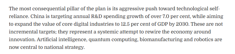文章認(rèn)為,“十五五”規(guī)劃綱要最具分量的支柱,在于對科技自立自強(qiáng)的強(qiáng)力推進(jìn)。中國明確提出,研發(fā)經(jīng)費(fèi)支出年均增長將超過7.0%,并力爭到2030年,核心數(shù)字經(jīng)濟(jì)產(chǎn)業(yè)增加值占GDP的比重提升至12.5%。這些并非漸進(jìn)式目標(biāo),而是一場以創(chuàng)新為核心、系統(tǒng)重構(gòu)經(jīng)濟(jì)體系的戰(zhàn)略轉(zhuǎn)型。人工智能、量子計(jì)算、生物制造與機(jī)器人技術(shù),已全面上升為國家戰(zhàn)略的核心。