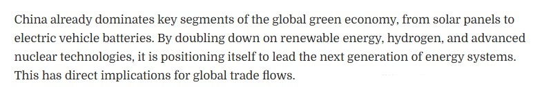 文章關(guān)注到,該規(guī)劃綱要將綠色發(fā)展置于中國經(jīng)濟(jì)轉(zhuǎn)型的核心位置。中國已在全球綠色經(jīng)濟(jì)的關(guān)鍵領(lǐng)域占據(jù)主導(dǎo)地位,從太陽能電池板到電動(dòng)汽車電池,無一例外。通過加大對可再生能源、氫能以及先進(jìn)核能技術(shù)的投入,中國正致力于成為下一代能源體系的引領(lǐng)者。這將對全球貿(mào)易格局產(chǎn)生直接影響。