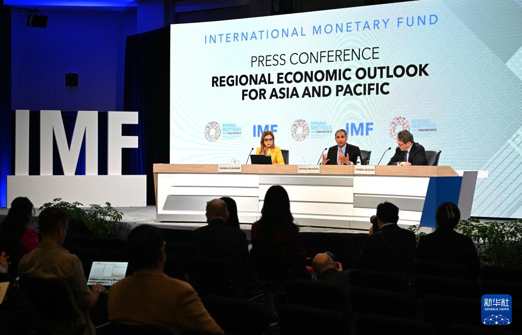 4月16日,在美國華盛頓,國際貨幣基金組織(IMF)亞太部主任斯里尼瓦桑(中)在新聞發(fā)布會上講話。新華社記者 李睿 攝