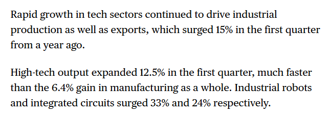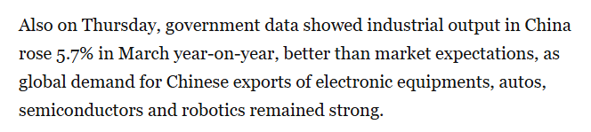 報道同時注意到,3月份中國工業(yè)增加值同比增長5.7%,強(qiáng)于市場預(yù)期,電子設(shè)備、汽車、半導(dǎo)體和機(jī)器人等產(chǎn)品的外部需求依然較強(qiáng),出口仍將是今年推動中國經(jīng)濟(jì)的重要力量。