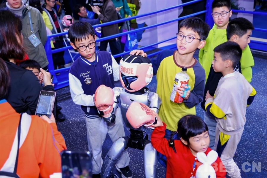 圖為小朋友們競相與機器人拳手互動。