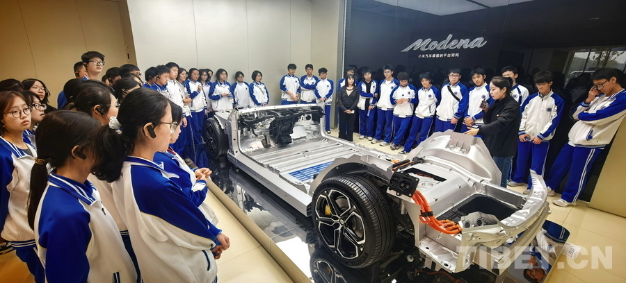學(xué)生們觀察小米汽車(chē)電池