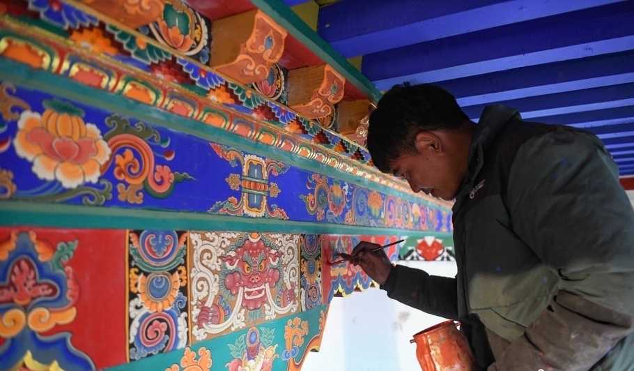 12月28日,西藏拉薩堆龍德慶區(qū),古俗民族傳統(tǒng)手工藝發(fā)展專業(yè)合作社員工在房屋上繪制藏式裝飾。[詳細(xì)] -