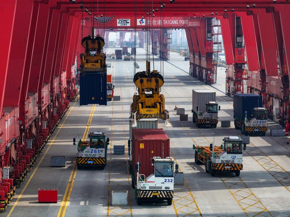 江蘇省蘇州港太倉(cāng)港區(qū)集裝箱碼頭(無(wú)人機(jī)照片,10月10日攝)。新華社記者 李博 攝