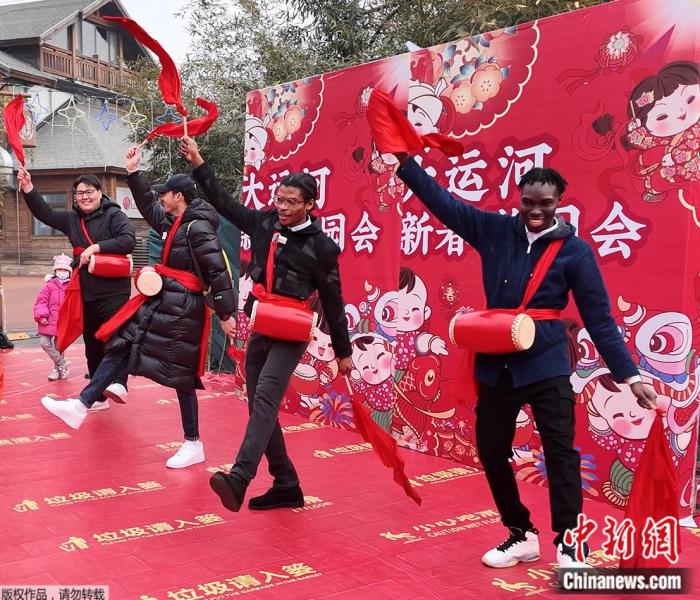 來自北京工業(yè)大學(xué)的四位留學(xué)生在北京通州大運(yùn)河新春游園會(huì)上體驗(yàn)打腰鼓。中新網(wǎng) 林勐男 攝