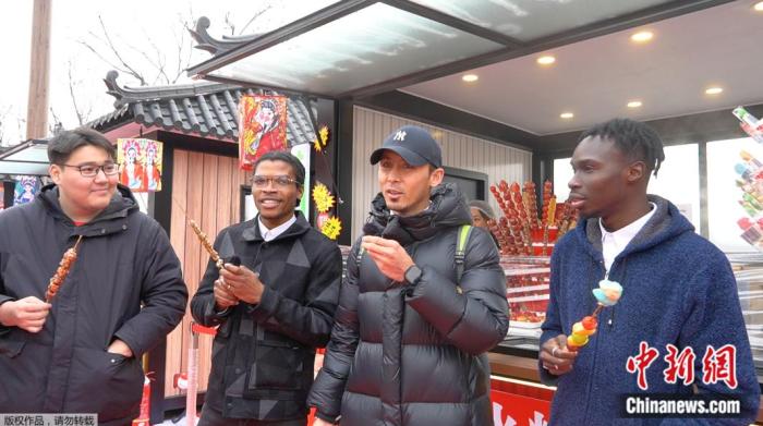 來自北京工業(yè)大學(xué)的四位留學(xué)生在北京通州大運(yùn)河新春游園會(huì)上品嘗冰糖葫蘆。中新網(wǎng) 林勐男 攝