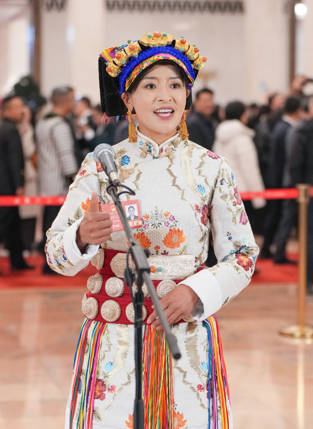 3月5日,第十四屆全國人民代表大會(huì)第三次會(huì)議首場“代表通道”集中采訪活動(dòng)在北京人民大會(huì)堂舉行。這是全國人大代表格西王姆接受媒體采訪。新華社記者 劉大偉 攝