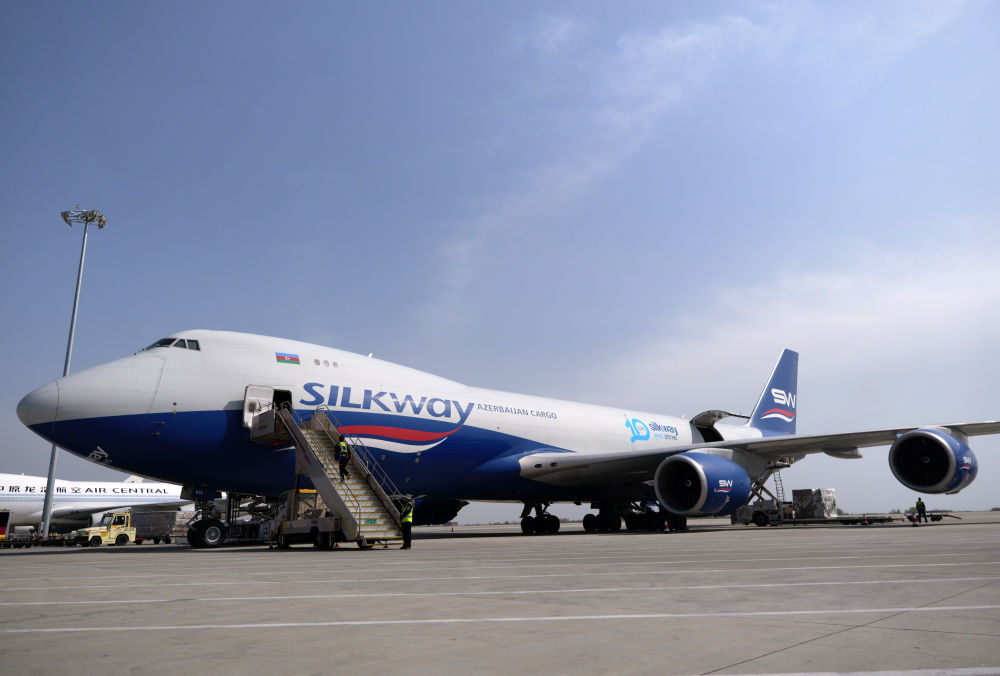 2025年4月2日,一架阿塞拜疆絲綢之路西部航空公司的貨機(jī)停靠在鄭州新鄭國際機(jī)場(chǎng)停機(jī)坪上。新華社記者 李嘉南 攝