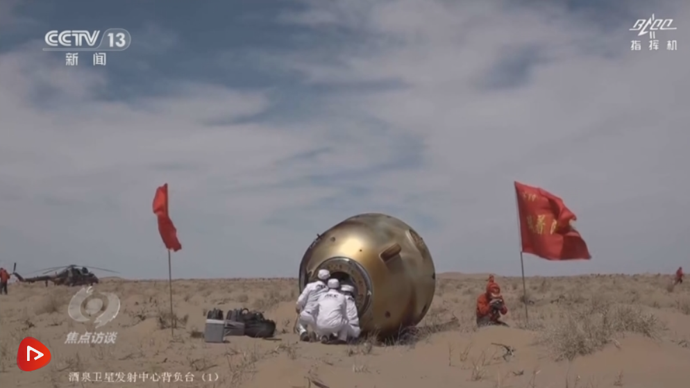 離地面最后一米,飛船返回艙反推發(fā)動(dòng)機(jī)工作,返回艙穩(wěn)穩(wěn)落地。著陸場(chǎng)的搜救人員也很快到達(dá)了現(xiàn)場(chǎng)。