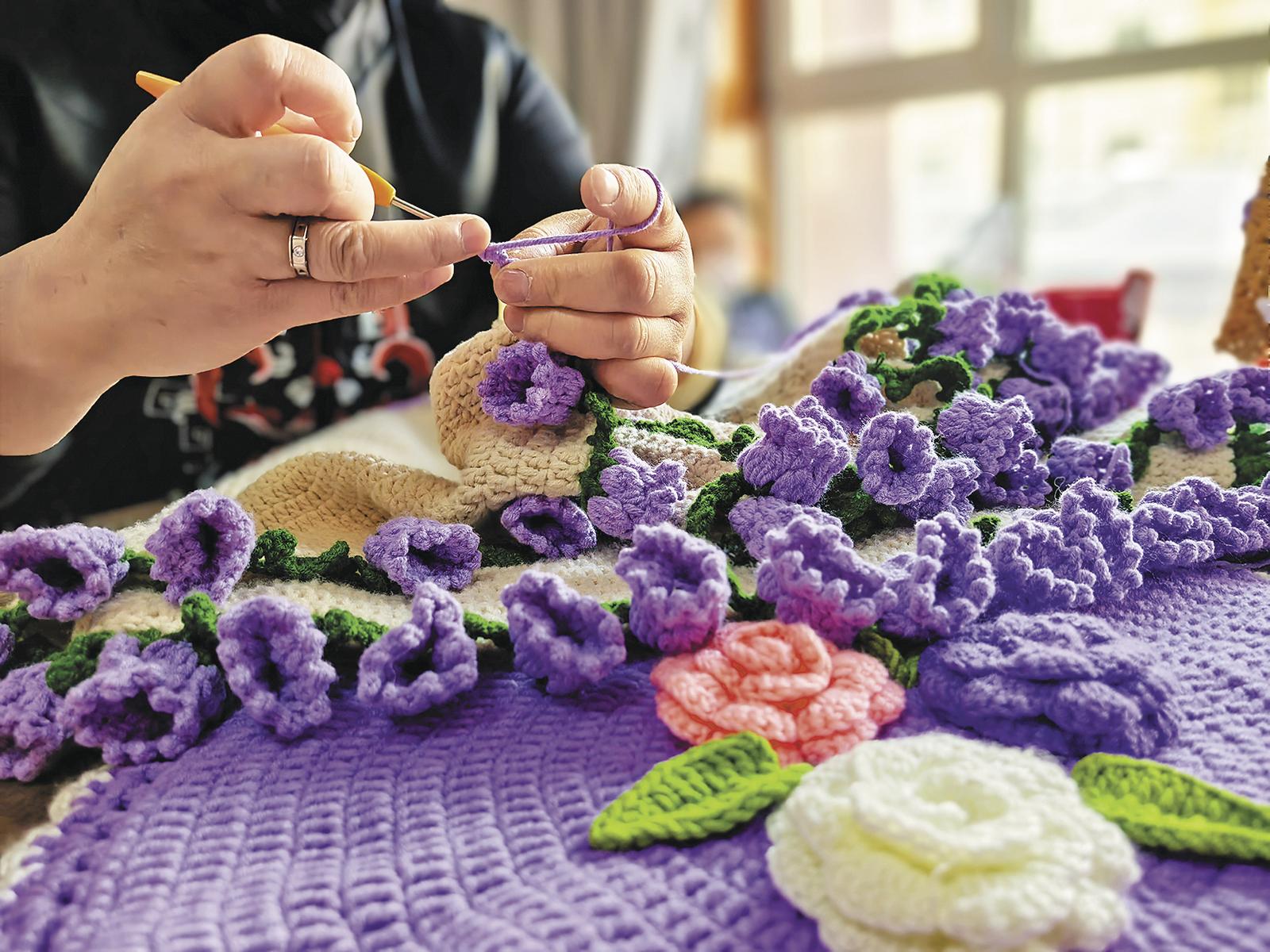 找到了目標就馬上行動,蓋毯、杯墊、發(fā)箍,玫瑰花、郁金香、鈴蘭花……各種花型的各類產(chǎn)品經(jīng)過她的一雙巧手被“創(chuàng)造”出來,成為工作室里最吸睛的“裝飾”,也吸引不少群眾前來“拜師學藝”。