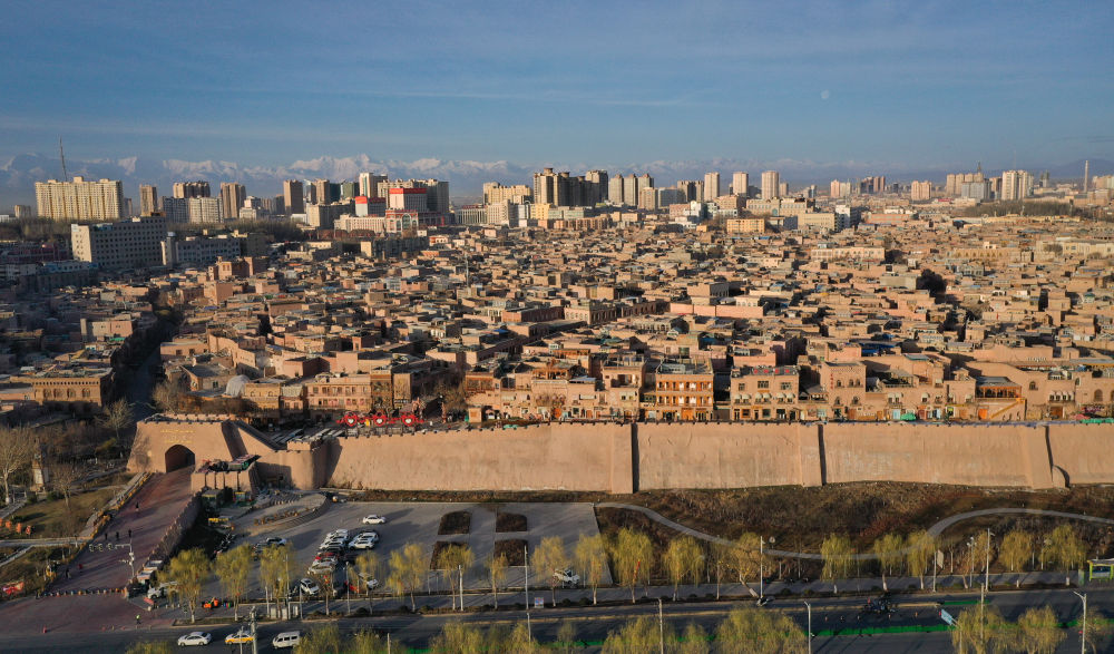 清晨,灑滿陽光的喀什古城(2023年3月10日,無人機(jī)拍攝)。新華社記者 李響 攝